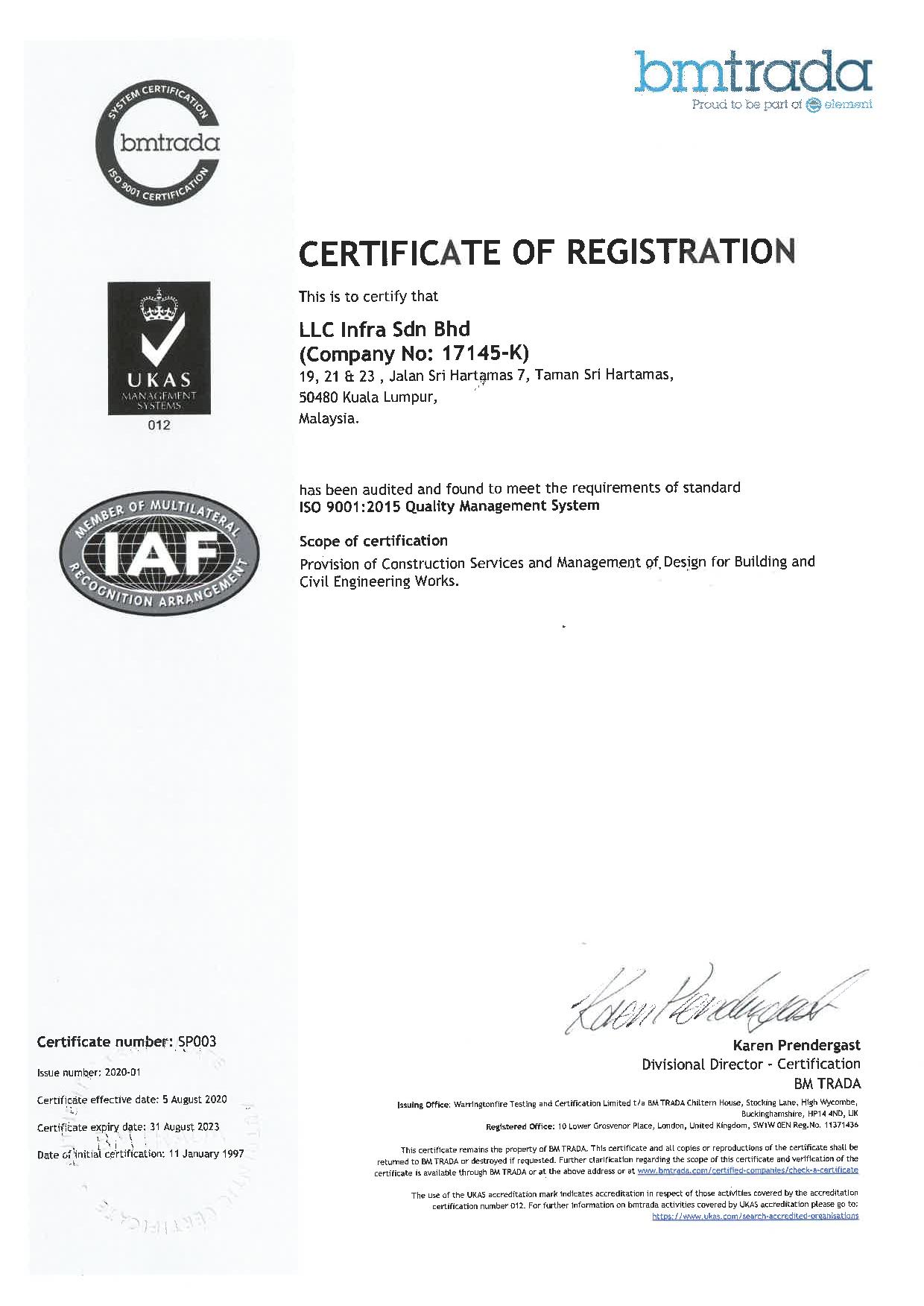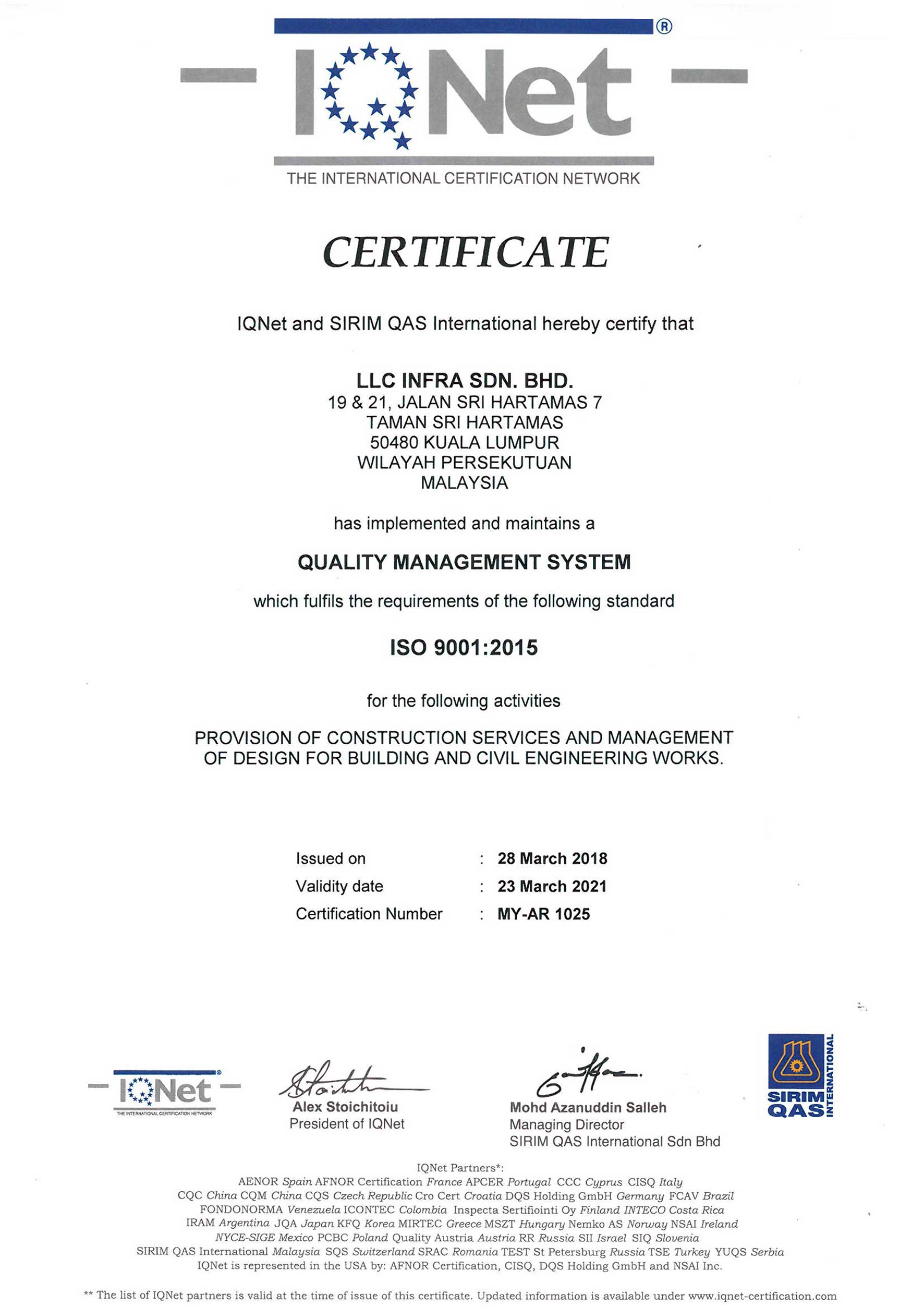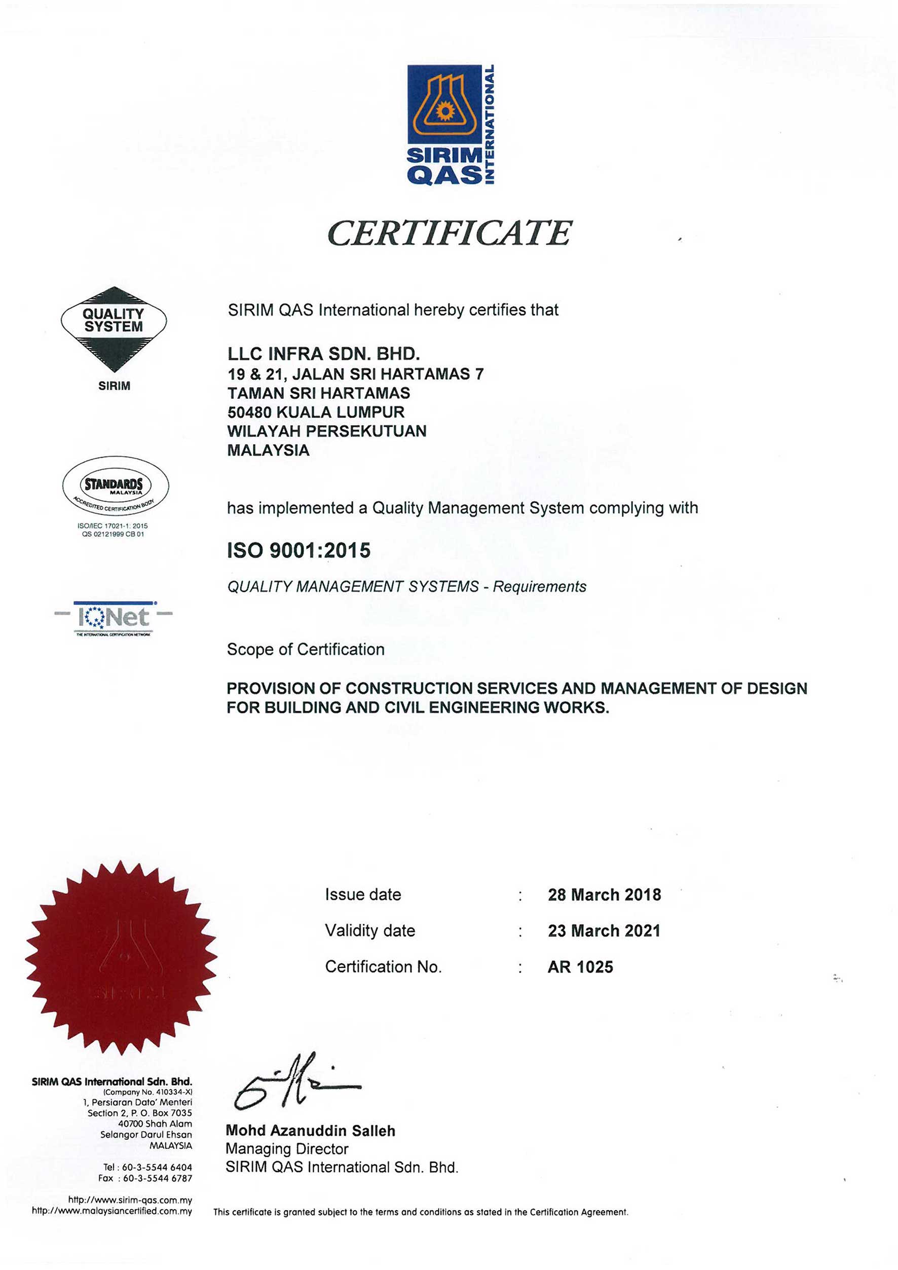 - SIRIM, Malaysia (Provision of Construction Services and Management of Design for Building and Civil Engineering Works) The ISO 9001 has been regularly reviewed by SIRIM and continues to be endorsed by them until today.